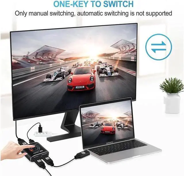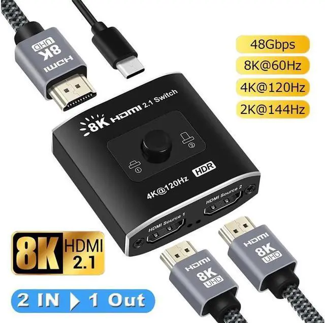 8K@60Hz/4K@120Hz HDMI Splitter, Switcher 2 in 1 Out --- Premium Aluminum alloy HDMI switch 2x1 easily streams video and audio from 2 different HDMI sources to 1 HDMI display, No lag, NO flash or drop in resolution. Release you from the plugging and unplugging HDMI cables, easily enjoy work time and playtime via switching between 2 devices with one button.