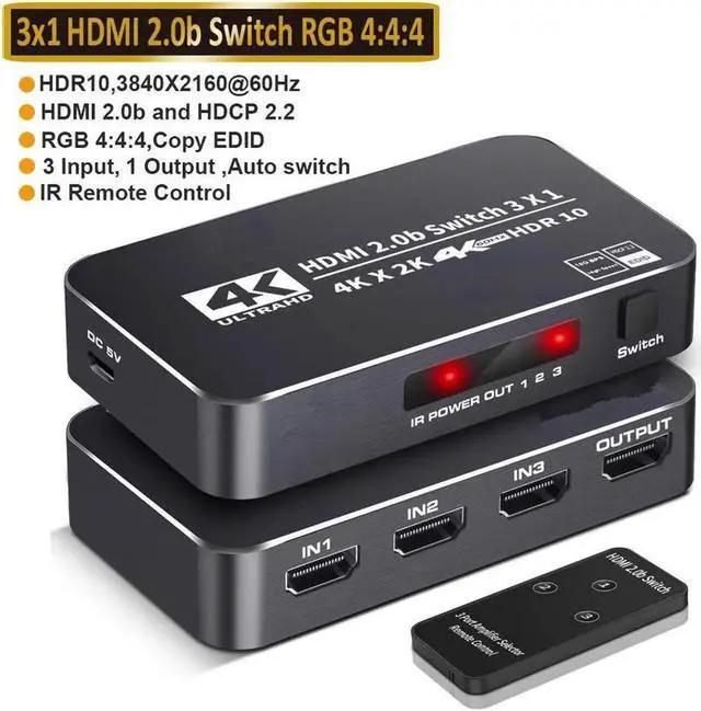 3 Ports 3in 1out HDMI 2.0 Switch Supports 4k@60Hz, HDR10, HDCP 2.2 / 1.4, RGB(