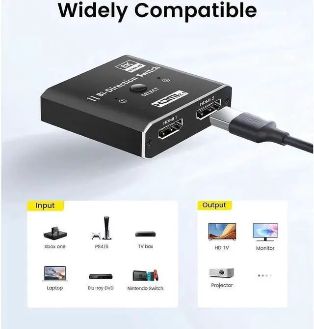 Switch Splitter: Allows you to connect two HDMI sources to one HDMI display (as switcher), or one HDMI source to toggle between two HDMI displays(as splitter, two screens CANNOT display at the same time). You can easily select the source or display at a push of a button, avoiding frequently plugging and unplugging causing damage to the HDMI interface of the device.