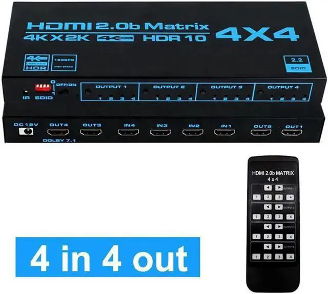 4x4 HDMI Matrix Switch,4 in 4 Out Matrix HDMI Video Switcher Splitter, Support 4K HDR, HDMI 2.0b, HDCP 2.2, 3D,1080P,with IR Remote Control