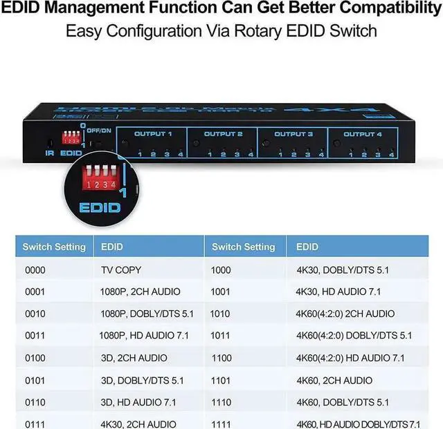 • 4 HDMI inputs switch and split to 4 HDMI displays
