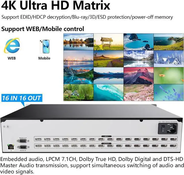 16x16 HDMI Matrix with Full-Color LCD Screen And Radio And Television Grade Crystal Visual Buttons, Real-Time Display Of Equipment Information, Fast Switching Of Input And Output Signals, Call And Save Of Pre-Plans, Etc.