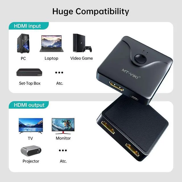 Bidirectional HDMI Switch: This two-input, one-output HDMI switch allows you to effortlessly connect multiple devices to a single display or use one device across two screens