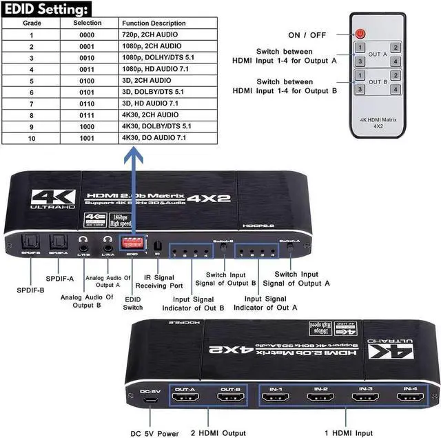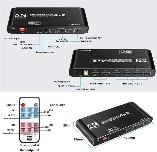 HDMI 2.0b and HDCP 2.2,4K@60Hz HDMI Matrix switch 4x2 with ARC,HIFI,HDR10,1x3.5mm Jack,1xSPDIF Audio,1xCoaxial Audio ,RGB 4:4:4/8:8:8(Dolby ATMOS) and 8 kinds of EDID mode.