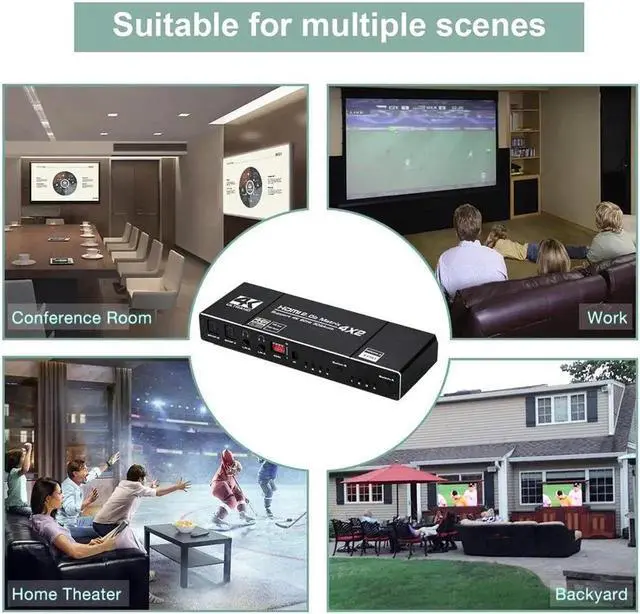 The 4 in 2 out HDMI matrix switch allows four HDMI devices to be easily switched or split into two HDMI compatible monitors or projectors. The device is also expanded with 2 3.55mmL/ Raudio output ports and 2 optical audio outputs Port (we give two optical audio cables, you don't need to purchase additional optical audio cables). Suitable for home theaters, villas, conference rooms, shopping centers, TV walls, schools and corporate training environments, etc.