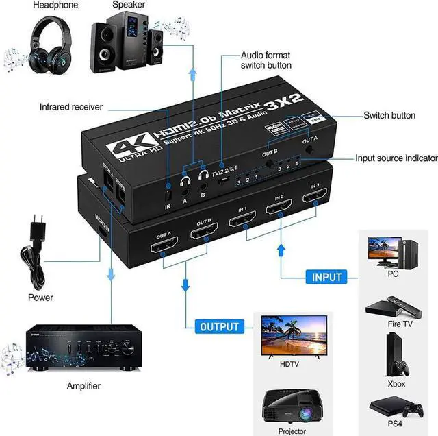 - HDMI Matrix 3x2: This HDMI Matrix Switch can connect three 4K HDR signal sources to 2 HD display or monitor, and it can also extract the HDMI input Audio signal with Toslink SPDIF optical fiber or 3.5mm stereo headphone output. This 3x2 HDMI Matrix can control by IR remote control and Local Button. It allows 3 HDMI Output devices to be switch or split easily to two HDMI compatible monitors or projectors.