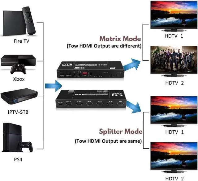HDMI Matrix 4x2: It can connect four 4K HDR signal sources to two HD display or monitor, and it can also extract the HDMI input Audio signal with Toslink SPDIF optical fiber or 3.5 mm stereo headphone output. It supports HDCP 2.2, HDMI 2.0 b, 4K@60HZ, RGB