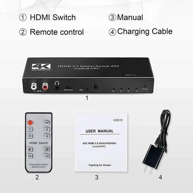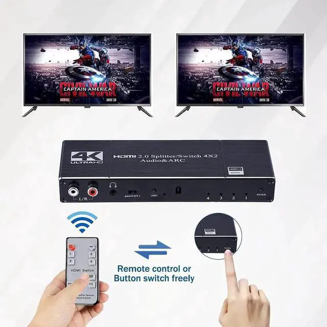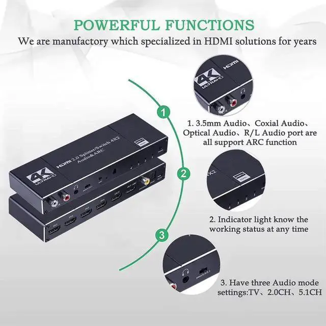 HDMI 2.0 and HDCP 1.4,4K@60Hz 4X2 HDMI Switch audio extractor with ARC,3.5mm Jack,L/R,Coaxial & optical Toslink SPDIF.support YUV4:2:0 for 4K@60Hz,EDID,IR remote control,HDR for 2K .