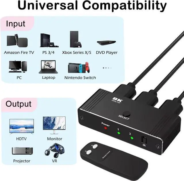Wide Compatibility: This HDMI 2.1 switcher is compatible with PC, PS4, PS5, Xbox series, projectors, monitors. Suitable for all devices with standard HDMI ports, it is the ultimate choice for gaming and movie enthusiasts.