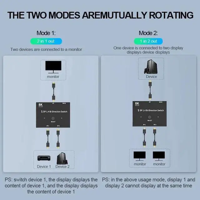 - Bi-Direction DP Switch: The DisplayPort switcher allow you to connect two DP source to one DP display or connect one DisplayPort source to toggle between two displays. (IMPORTANT