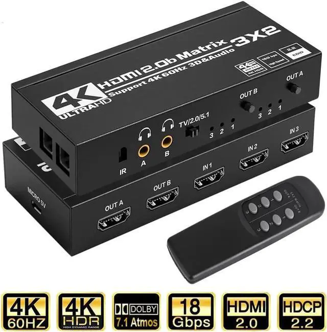 - HDMI Matrix 3x2: This HDMI Matrix Switch can connect three 4K HDR signal sources to 2 HD display or monitor, and it can also extract the HDMI input Audio signal with Toslink SPDIF optical fiber or 3.5mm stereo headphone output. This 3x2 HDMI Matrix can control by IR remote control and Local Button. It allows 3 HDMI Output devices to be switch or split easily to two HDMI compatible monitors or projectors.
