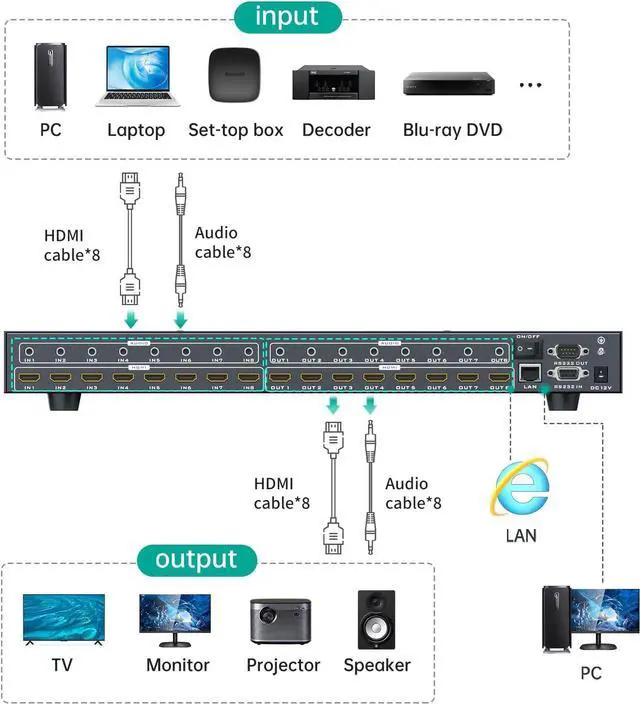 8K Resolution: This HDMI matrix 8 in 8 out supports 8K@60Hz, 4K@120Hz, 1080P@210Hz. Supports HDMI 2.1 standard and HDCP2.2 (and all earlier versions supported). Auto scaling-down scaling on all outputs