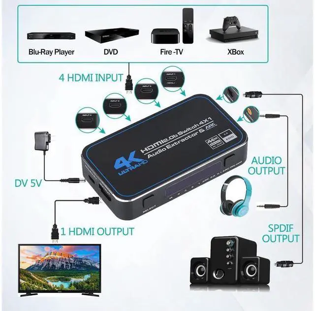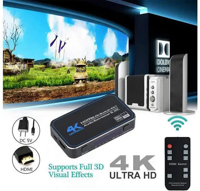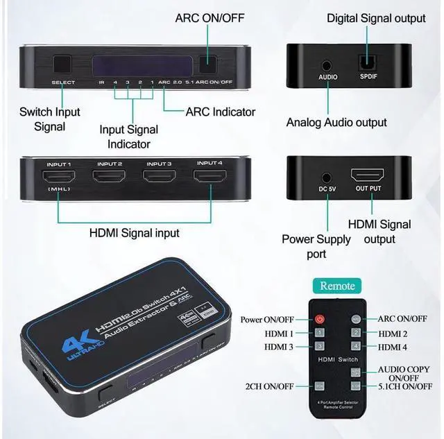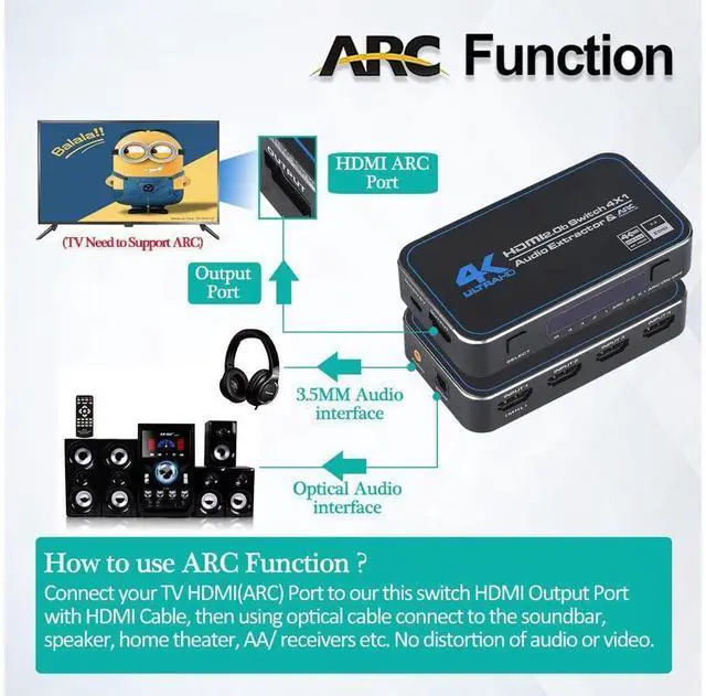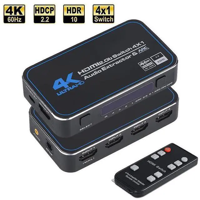 2.0 (YUV 4:2: 0), can easily select 4 HDMI sources that scale up to 4K@60Hz to a single HDMI output which your want to output. The HDMI Switcher support 12bit per channel (48bit all channels) Deep Color, Support ARC function. The HDMI Output can be selected by a local button or an IR wireless remote control.