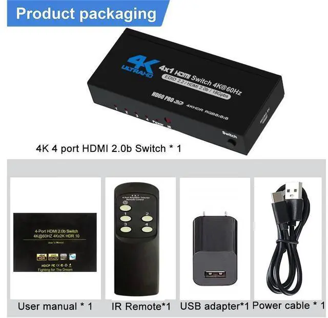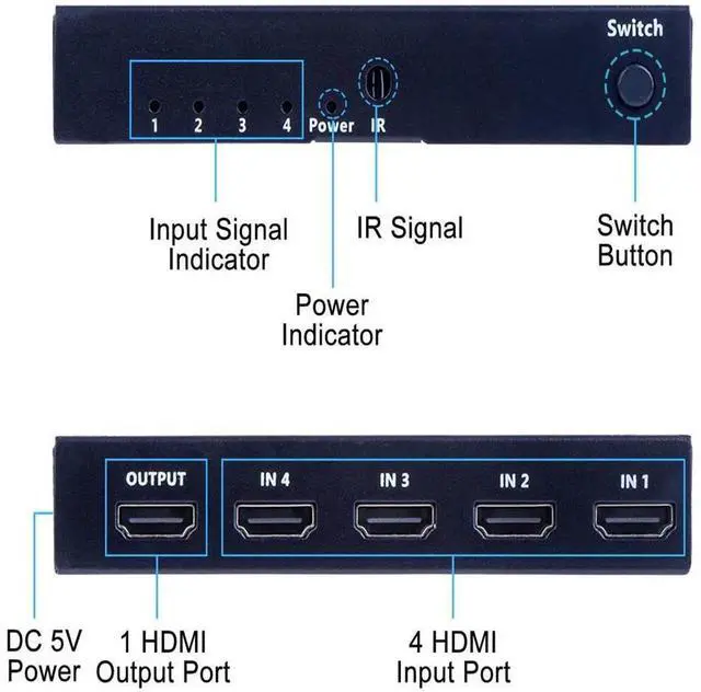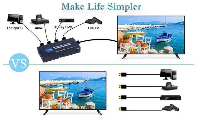 [4 Input 1 Output 2.0 Switch] HDMI 4 in 1 Switch connects up to 4 HDMI source components to one HD Display, solving your multiple HDMI devices issue. Seamlessly switch between games, TV, desktop, creating a superb picture quality and seamless sound. NO lag, NO flash or drop in resolution.