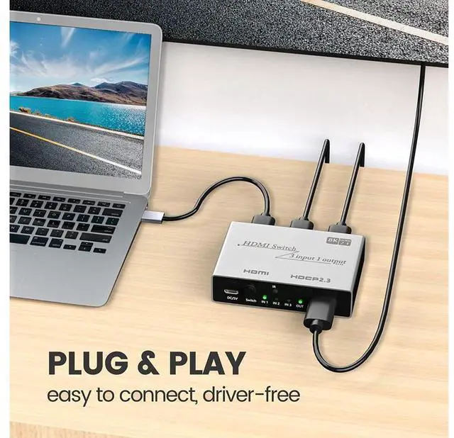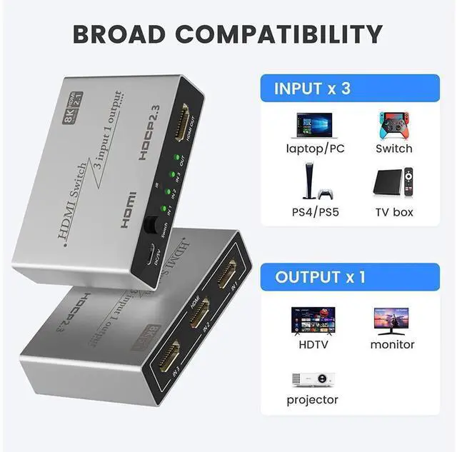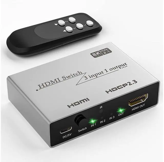 Packageincluded: 1 x HDMI 3X1 switch 1 x USB power supply line 1 x Remote control 1 x Operating instructions