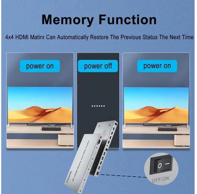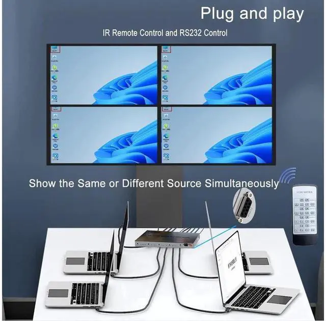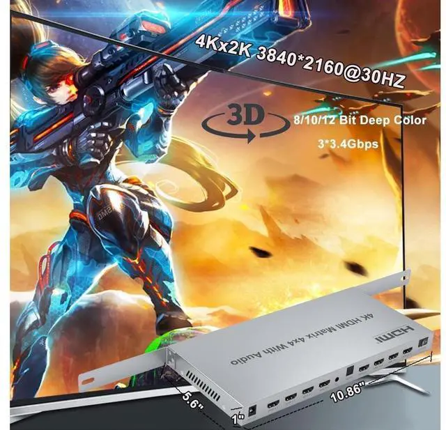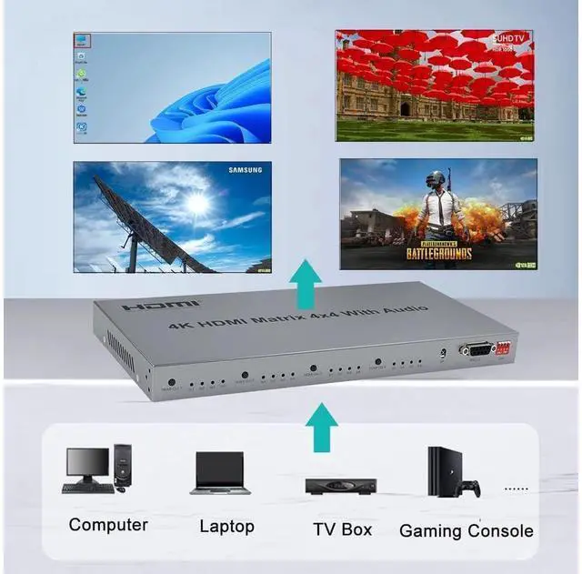 4k HDMI matrix 4x4 can connect 4 HD signal sources to 4 HD display terminals with optical fiber and stereo headphone output at the same time via HDMI out 1 port. 4 HDMI outputs can share the same or the different picture, and can allows you switch or split easily to 4 HDMI compatible monitors or projectors without flash screen or any loss in quality. Reach max resultion 3840x2160@30HZ and are widely used in space andsecurity concerns, data center control, information distribution, conference room presentation, school and corporate training environments.