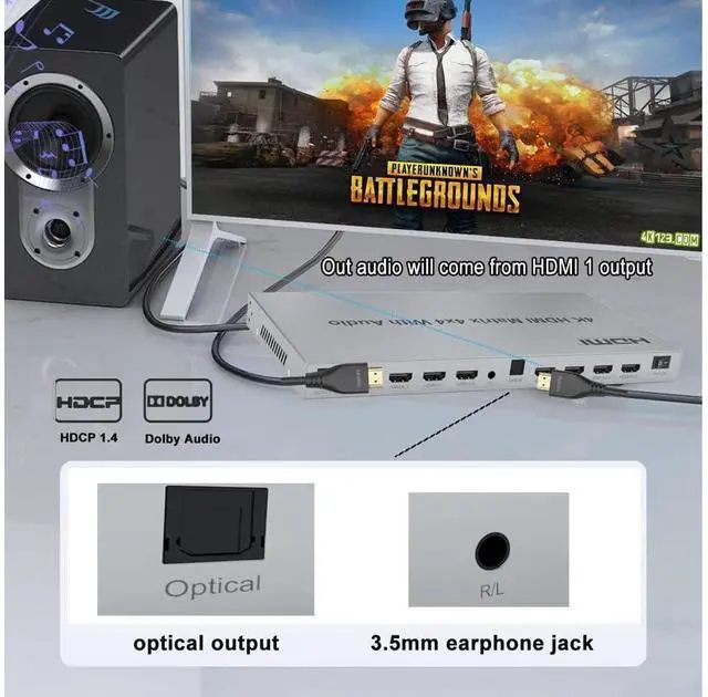 * Via HDMI out1, support 3.5 mm earphone jack and optical output at same time;