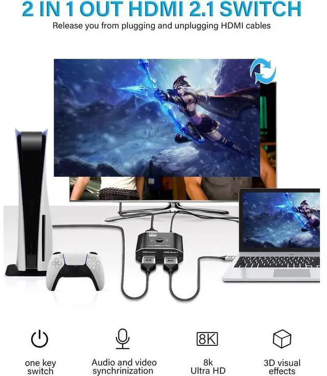 Output: Premium Aluminum alloy HDMI switch 2x1 easily streams video and audio from 2 different HDMI sources to 1 HDMI display, NO lag, NO flash or drop in resolution. Release you from the plugging and unplugging HDMI cables, easily enjoy work time and playtime via switching between 2 devices with one button.