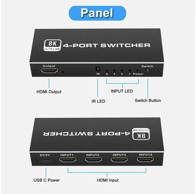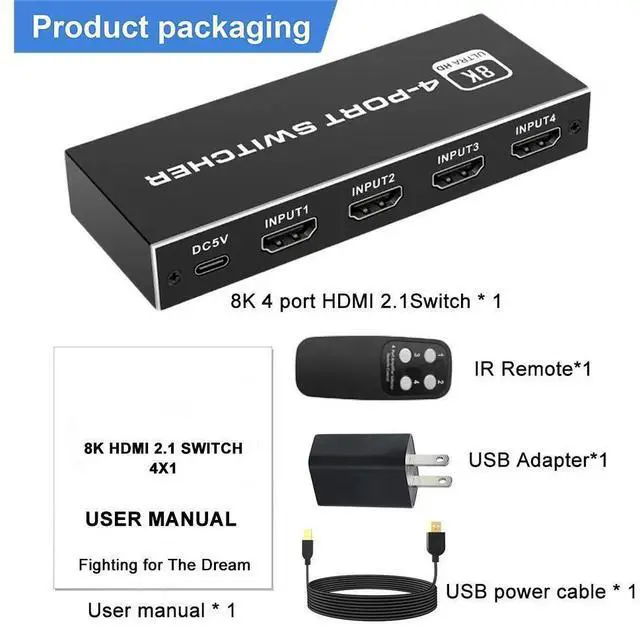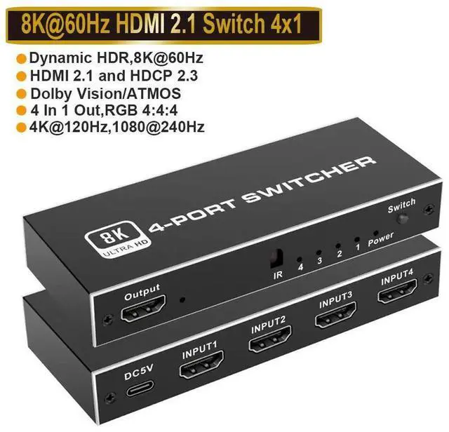 OZ8Q4 8K@60Hz 4K@120Hz HDMI Switch can connect 4 HDMI sources like blu-ray player and PS3, PS4, PS4 pro, PS5 etc, to a single HDMI display like HDTV. and you can switch the HD sources very conveniently by using IR remote control or the easy-click switch button on the unit. The system is compatible with HDMI-compatible 2.1, 3D and 8K Ultra HD.
