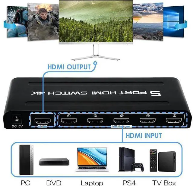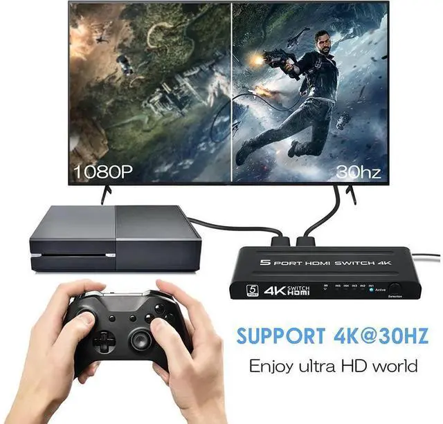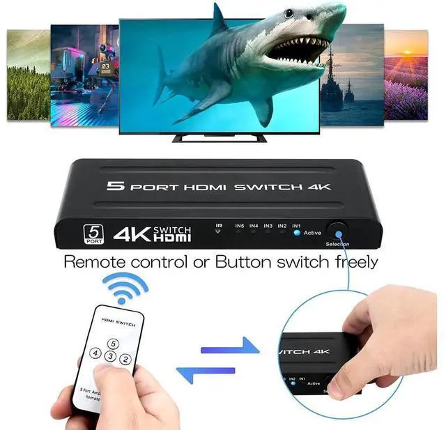 5 Port HDMI video switcher input 5 channel HDMI HD video to the switcher, according to user needs, the video switch output to a monitor, there are remote control switch and button switch 2 ways for users to use, convenient and fast!