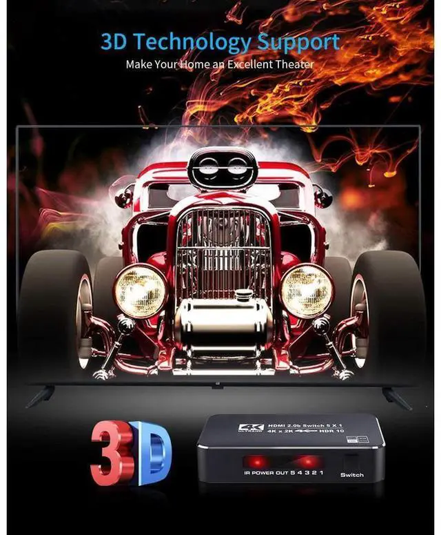 4K HDR and Dolby Vision: The HDMI switch 5 in 1 out 4K@60Hz, HDR, HDR10 2k, 1080P @ 60Hz, 1080P@30Hz, 3D, RGB(