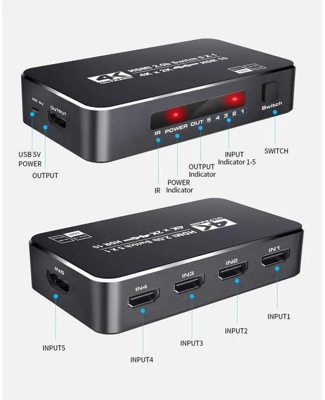 • 5 Input 1 Output HDMI Switch: Easily switch 5 HDMI sources to a single HDMI output by a local select button or IR remote control.