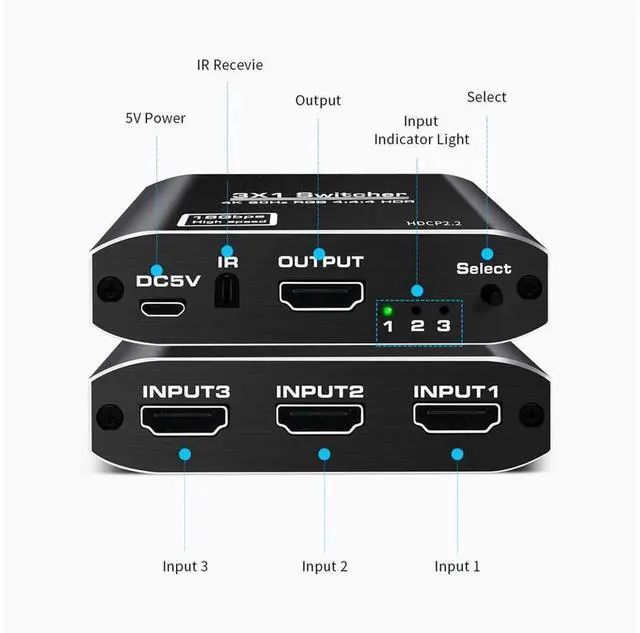 4. 3 Way Easy Switch - Manually switch with the select button or the wireless remote. Automatically switch to the new active HDMI input.