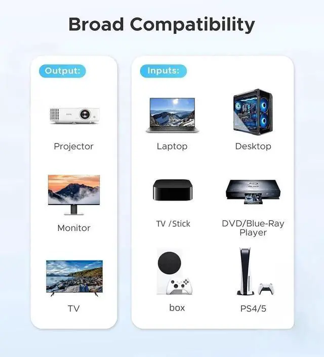 [Universal Compatible]: This 8K HDMI Switch 3 in 1 out is suitable for most HDMI sources. Compatible Input: PS5/4/3, TV B-o-x, b-o-x, Switch, PC, Blu-ray DVD Player, etc.; Compatible Output: TV, Monitor, Projector, etc.Please note: Don't support ARC/eARC.