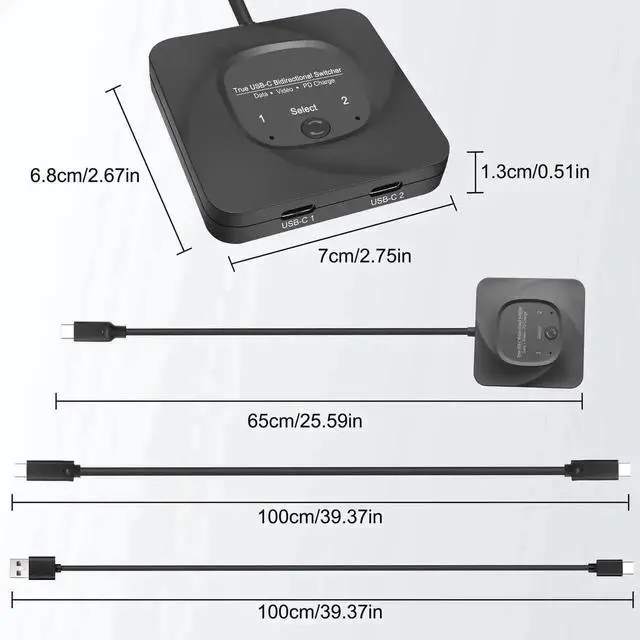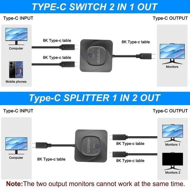 -The Type-c Bidirectional switch allows you to connect two Type-c signal sources to one Type-c display(as switcher), or connect one Type-c signal source to toggle between two Type-c displays(as splitter).