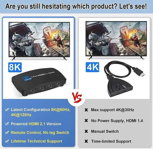 Stable Transmission: 8K@60Hz HDMI 2.1 switch uses the latest chips, made of sturdy housing, anti-corrosion construction can also resist overheat or break, more durable & useful. HDMI Switch supports most devices with a standard HDMI interface.
