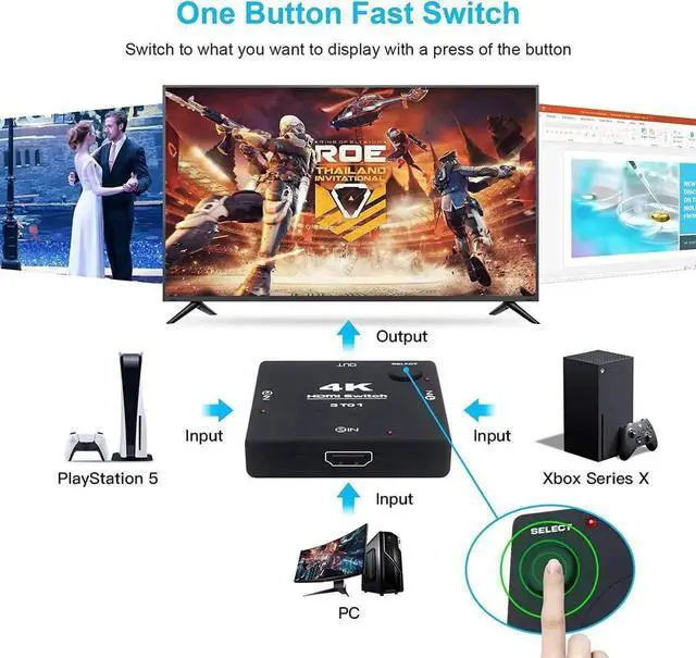 4K 60Hz HDMI Switch 3x1: The upgraded 4K@60Hz HDMI Switch allows you to connect to three different HDMI sources (e.g. XBX, PS5, PC) simultaneously and switch what you want to display on one single display (e.g. TV/Monitor/Projector) with a press of the select button. NO lag, NO signal drop or distortion. Release you from the hassle of unplugging and plugging HDMI cables constantly.