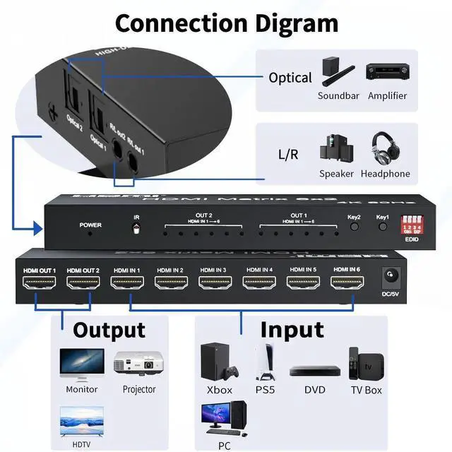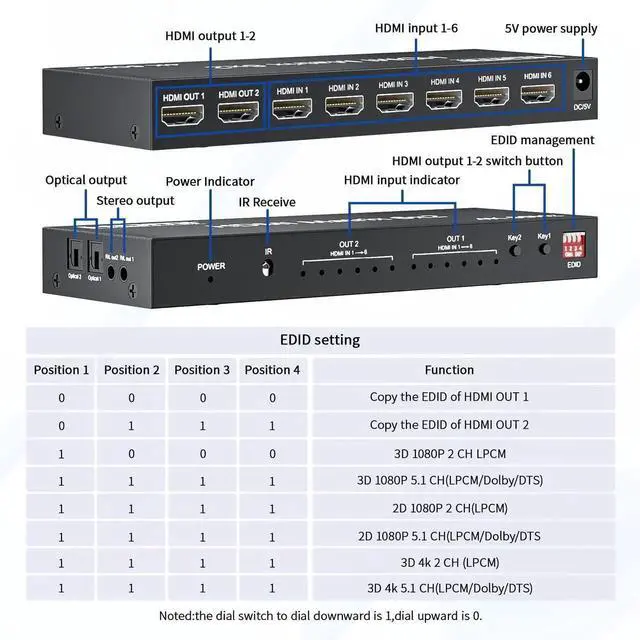 - Support extract the audio from output 1 and send it to the digital optical SPDIF and 3.5mm stereo analog audio outputs