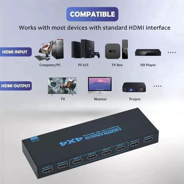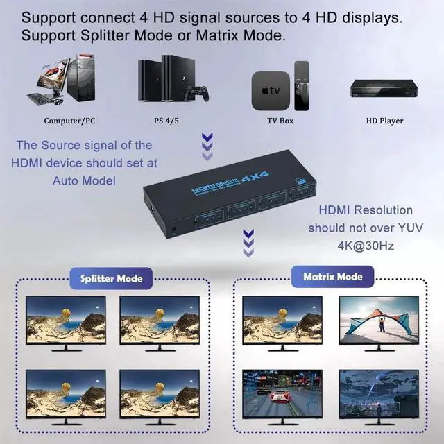 HDMI Matrix Switch 4x4: This HDMI Matrix Switch 4x4 can connect 4 HD signal sources to 4 HD display terminals not over YUV 4K@30Hz. The matrix allows 4 HDMI devices to be switched or split easily to 4 HDMI compatible monitors or projectors. It supports HDMI 1.4, 1080P@60Hz, 3D, YUV