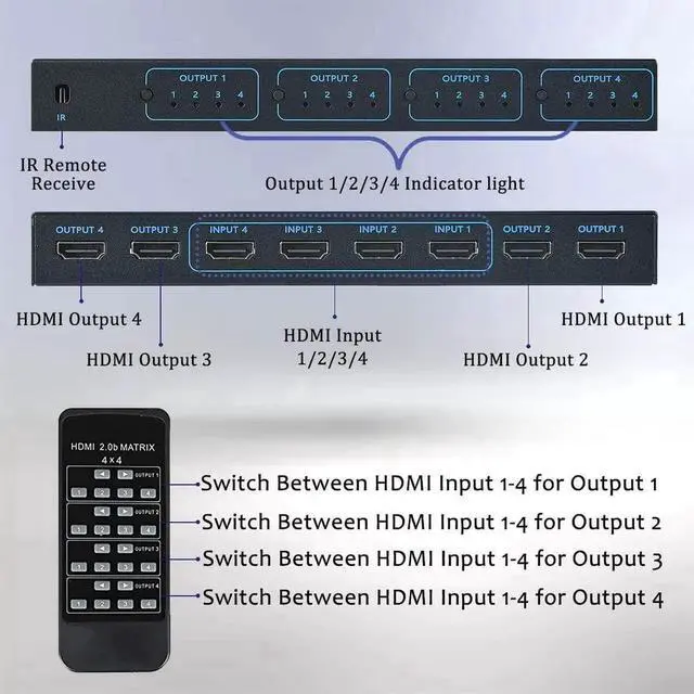 4:2: 0. This 4x4 HDMI Matrix Switch can be controlled by a IR remote control. When Switch by a local button or remote control, Please Wait 3-5S to show on display. Not Seamless