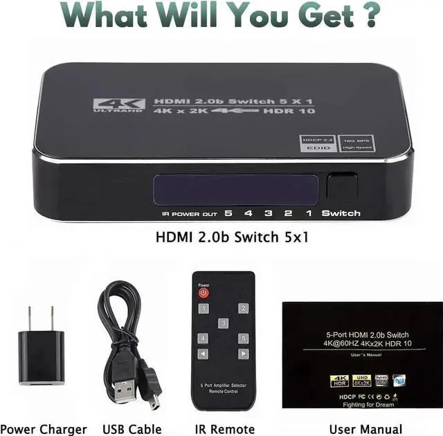 4K HDR and Dolby Vision: The HDMI switch 5 in 1 out 4K@60Hz, HDR, HDR10 2k, 1080P @ 60Hz, 1080P@30Hz, 3D, RGB(