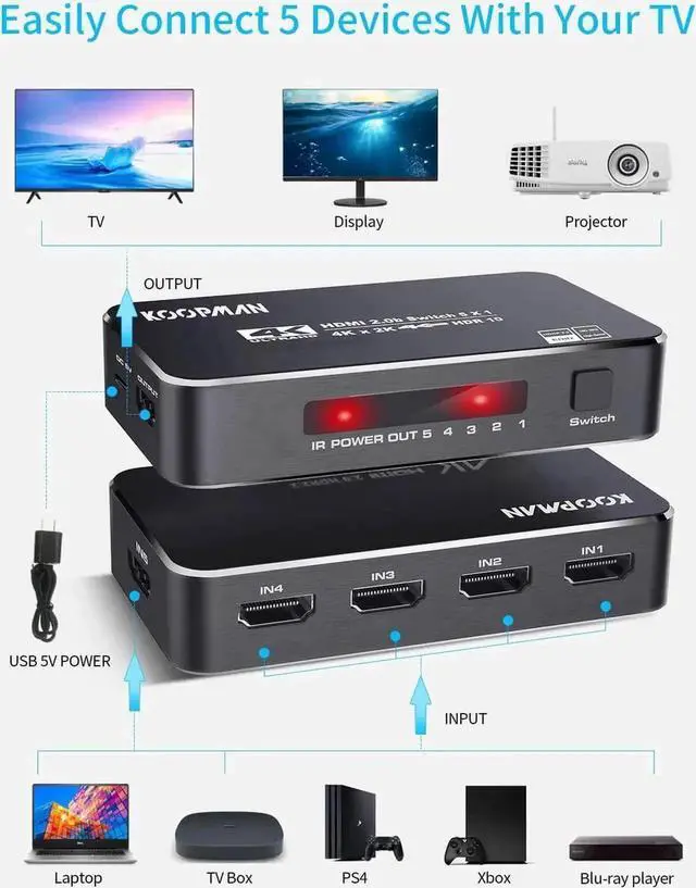 Output HDMI Switch: Easily switch 5 HDMI sources to a single HDMI output by a local select button or IR remote control.