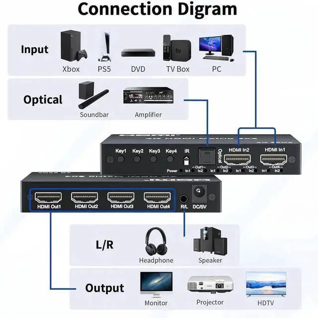 Widely Compatible: Input port can connect HDMI source devices like VCD/DVD player, Blu ray players, Xbox, Fire TV, Amazon Fire stick box, PS3, PS4, PS5, PC and etc. Out port can connect monitor, projector, HDTV and more
