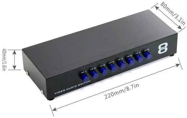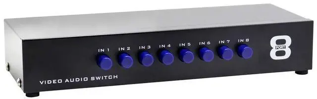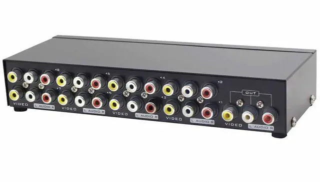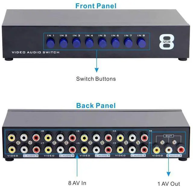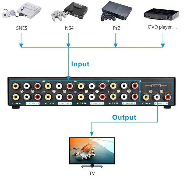 Panlong 8 In 1 Out RCA switch box lets you connect up to eight composite video and stereo audio sources that have yellow-white-red RCA connectors, such as Wii, XBOX, DVD, PS2, Nintendo, etc. Simply push the button, you can switch back and forth between them without un-plugging/re-plugging cables.