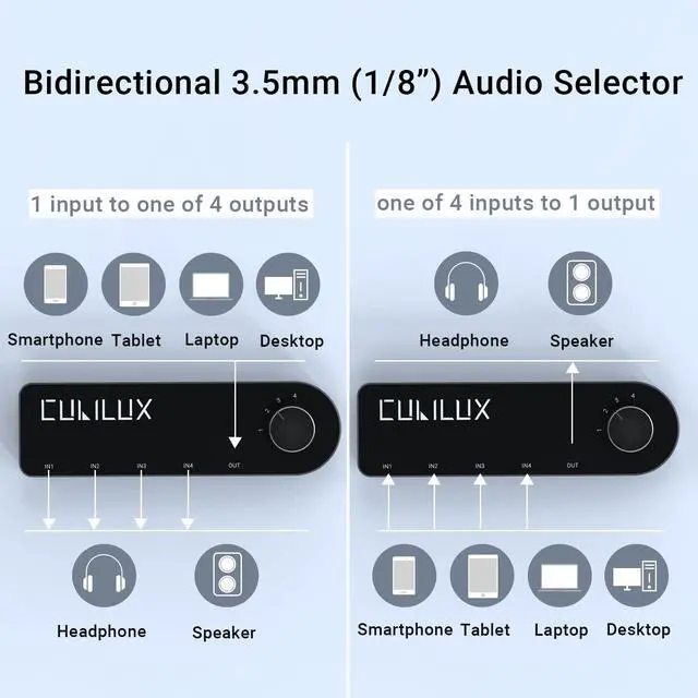 Cubilux Audio Selector makes sound switching between input and output devices trivial, with a single twist and you are good to go, no need for complicated setup, just simply plug and play. The bidirectional design is perfect for connecting multiple input or output devices, or making sound comparison between different sources or headphones.