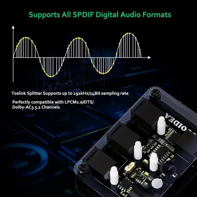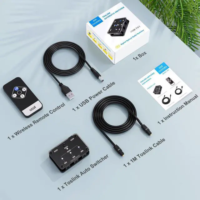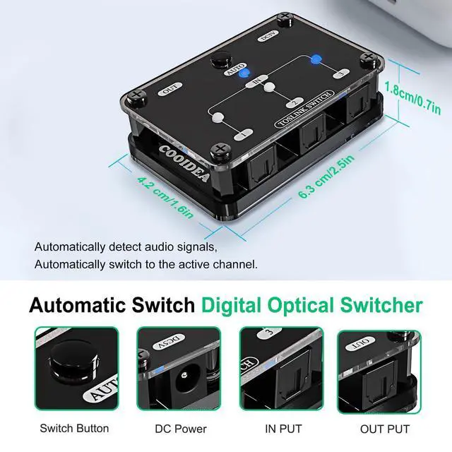 The Cooidea TosLink Audio Auto Switcher is a 3-input 1-output optical audio switcher that can detect inputsignals in real-time and switch automatically. it supports up to 192kHz samplingrate at 24-bit and comes with a wireless remote controller.