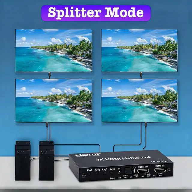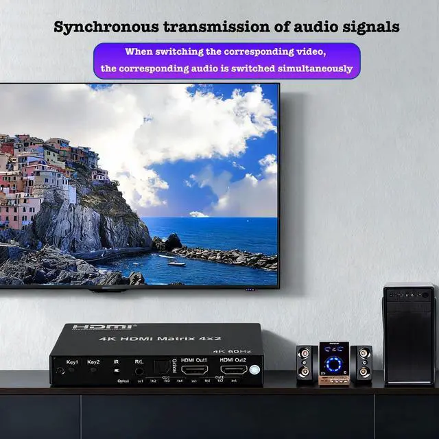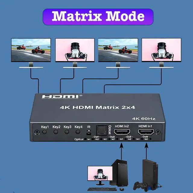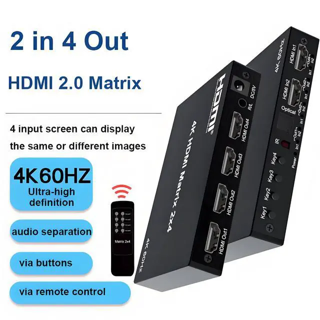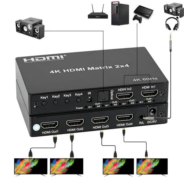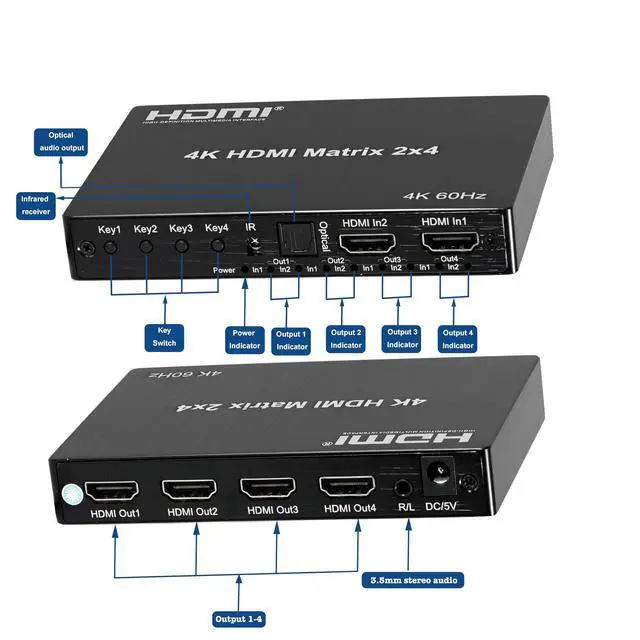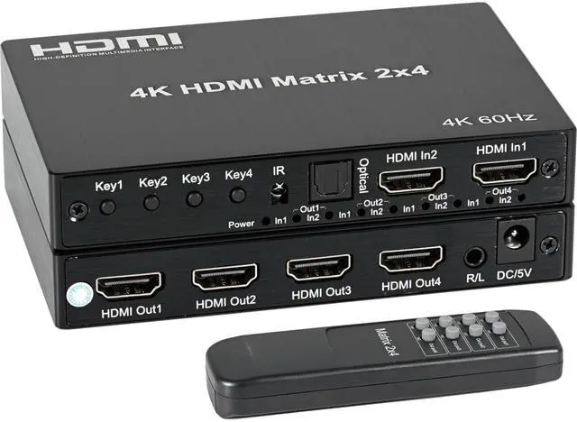 4K 2x4 HDMI Matrix Switch with 3.5mm Stereo Audio Extractor and Audio Optic Output