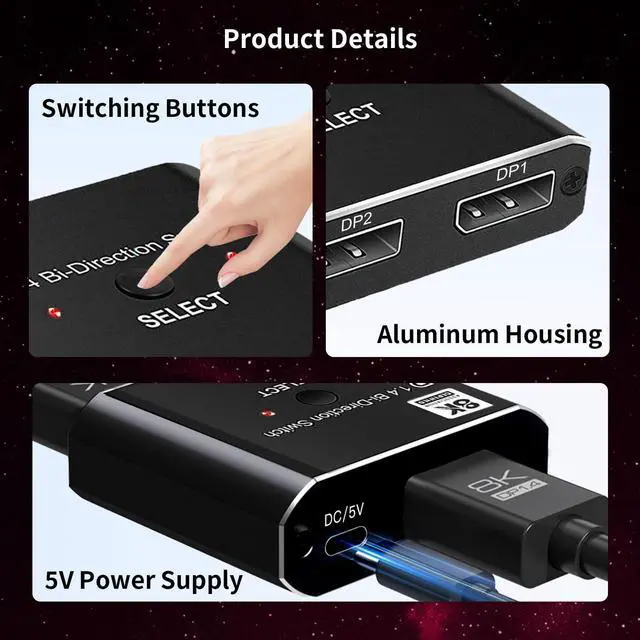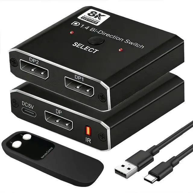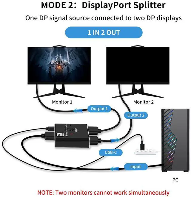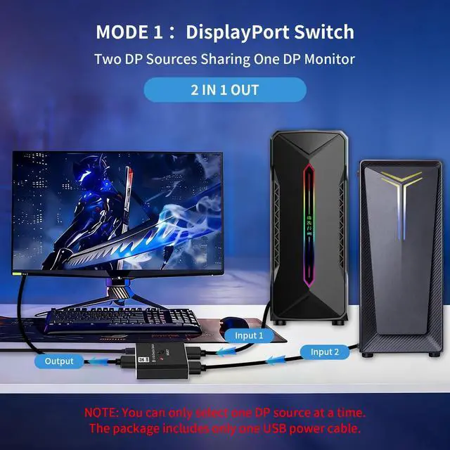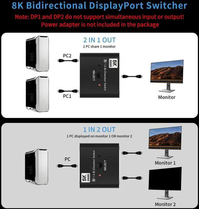 Bidirectional DisplayPort SwitchThis displayport splitter 1 in 2 out enables two DP video sources to share one DP monitor, or one DP video source to share two monitors. Crafted from premium materials with an upgraded high-performance chip, it ensures compatibility with monitors, laptops, projectors, and more, delivering an exceptional audiovisual experience. Note: Both monitors cannot display simultaneously. Only one video source can be selected at a time. Use the included USB power cable for power, no power adapter is included in the package