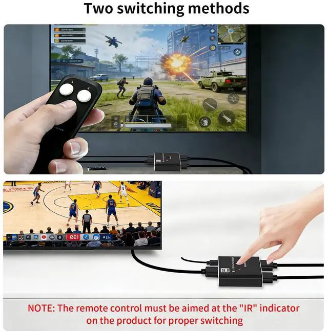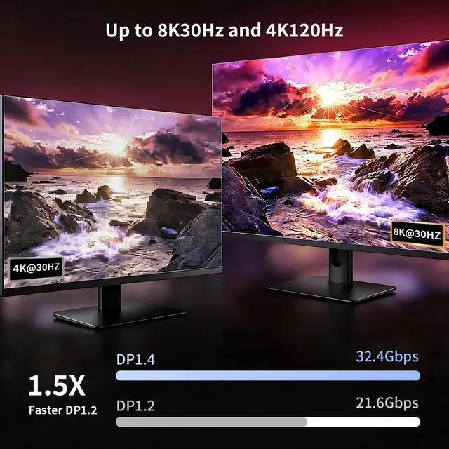 8K Ultra HD ResolutionThis displayport switcher 2 in 1 out supports resolutions up to 8K@30Hz and is backward compatible with 4K@120Hz, 1080P@240Hz, and other resolutions. It delivers high-quality visuals, making it ideal for various display needs, with a transmission rate of up to 32.4Gbps. Note: Actual resolution depends on hardware configuration. When using 8K30Hz resolution, ensure both the DP cable and your device support 8K30Hz. Use a standard DP 1.4 cable with a length not exceeding 1.8 meters