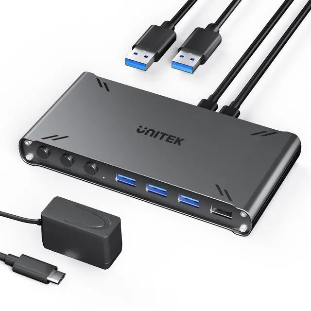 HDMI KVM Switch 1 Monitor 2 Computers 4K@30Hz USB C Switcher Sharing Keyboard Mouse Printer with 5 USB Ports 10Gbps 2 USB Cables Power Adapter PC/Mac Compatible File Drag-and-Drop Transfer
