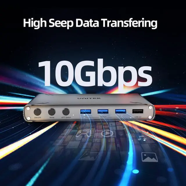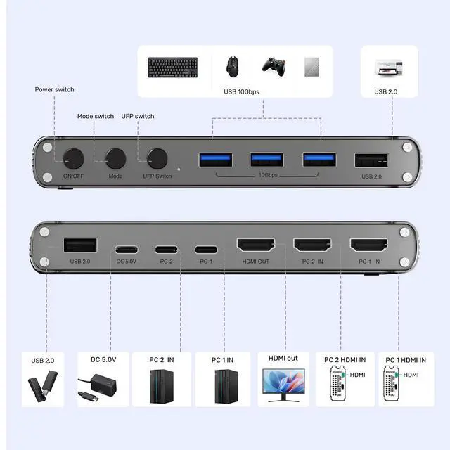 UFP Switch Button - Press the UFP button to switch the multi USB devices between two hosts. This button needs to be used in conjunction with the MODE BUTTON. After selecting different modes, use the UFP button to switch USB devices to the corresponding host for use. When in split-screen mode, no UFP button operation is required as the USB devices are shared between both hosts simultaneously. For Storage Device Control - Includes a UFP toggle switch to manually shift USB storage devices (e.g., hard drives) between hosts, ensuring uninterrupted access even if one computer powers off.