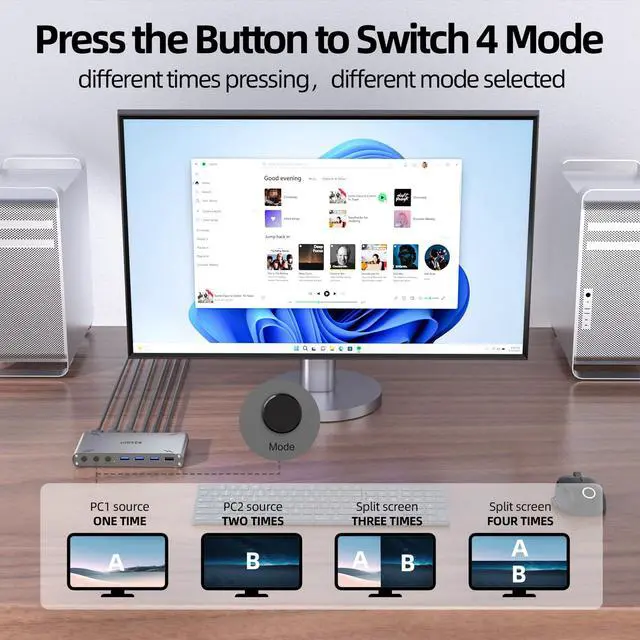 Mode Switch Button - The MODE button exclusively controls video source switching functionality Single press: Displays Host A video source Double press: Displays Host B's video source Triple/Quad press: Activates split-screen mode to display both hosts' video sources simultaneously.