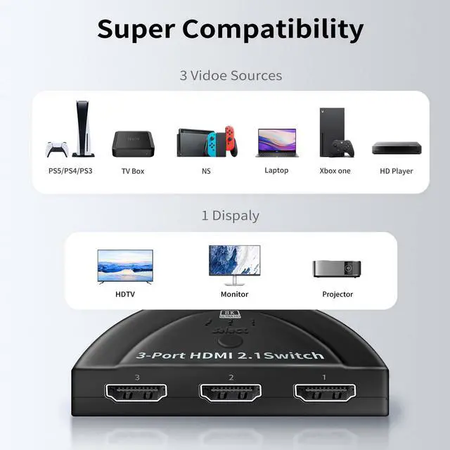 [HDMI 2.1 Switch]: NEWCARE 3x1 HDMI switch allows you to connect up to 3 HDMI sources to a single HDMI display, eliminating the hassle of plugging and unplugging cables. Compatible with a wide range of HDMI devices including PCs, laptops, Xbox 360, PS3/4/5, Roku, Amazon Fire TV Stick, Blu-ray players, and more. Input: 3 HDMI sources; Output: Full HD TVs, projectors, monitors, and other HDMI-enabled displays. (Note: Only supports 3 inputs to 1 output. The product is not compatible with MAC MINI (M4), 4K120HZ Sony TV.)