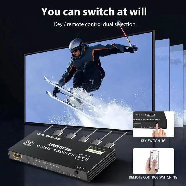 Up to 8K 60Hz: The 5-Port HDMI 2.1 Switch Selector supports up to 8K@60Hz, 4K@120Hz, 2K@144Hz, 1080p@240hz. This 8K HDMI switcher also supports HDR HDCP 2.3 DPCP and 3D; High refresh rate immerses yourself in an incredible viewing experience