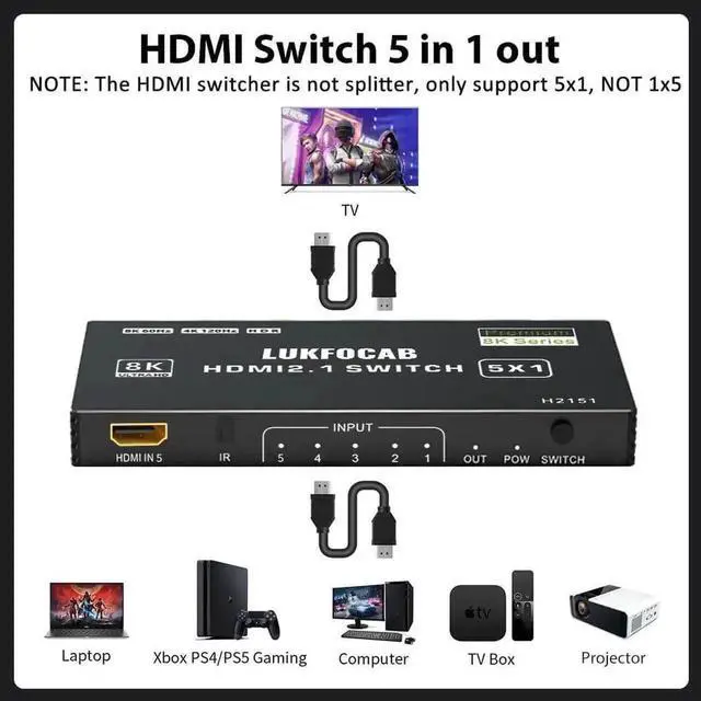 HDMI Switch: Multiple HDMI Hub allow to connect any Five HDMI source devices to One HD TV/monitor or projector. Plug and play, perfect for home, office, meeting and other places (Not HDMI splitter 1 In 5 Out)