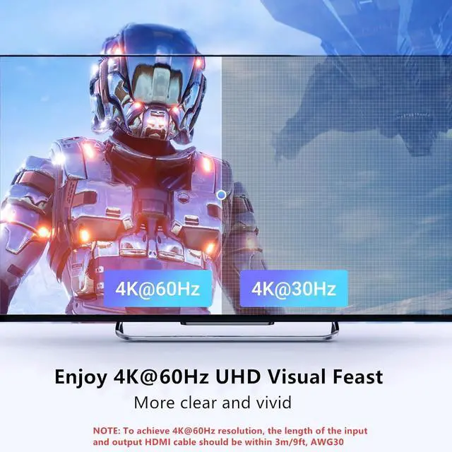 Note: 1, To reach 4K@60Hz, the length of the input and output HDMI cable should be within 3m/9ft. 2, To ensure proper operation, ensure that this 4K HDMI switch is connected to a power source when using. 3, Automatic switching is NOT supported. 4, USB power cable included, Power adapter NOT included. 5, No include battery and HDMI cable